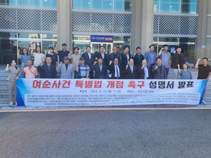 [기사보강: 13시 40분] 우리는 여순사건법 일부개정법률안의 신속 통과를 위해 다음과 같이 정부에 요구한다.하나, 정부는 진상조사 및 자료분석, 보고서 작성 법정기한을 연장하도록 특별법을 조속히 개정하라! 하나, 정부는 정치적 중립과 균형있는 역사관을 고려하여 진상보고서작성기획단을 재구성하라! 하나, 정부는 여순사건 희생자․유족에게 특별재심의 근거를 마련하여 실질적인 명예회복을 보장하라! 정부는 여수·순천 10·19사건 진상규명 및 희생자 명예회복에 관한 특별법을 조속히 개정하라!이대로는 안된다23일 오전 11시 여수시청 현관앞에