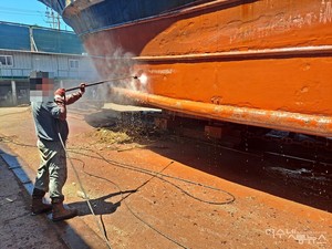 여수 돌산 우두리 선박건조 수리업체인 A, B 조선소. 작업자가 선박을 세척하는 과정에서 발생한 오염수가 인근 바다로 그대로 흘러들고 있다.28일 이들 조선소 작업자가 선박세척 후 그라인딩을 하자 먼지와 분진이 주변으로 흩날린다. 오염수를 차단하기 위한 설비와 집진기를 사용하지 않고 외부에서 작업을 한다.A 조선소 작업자는 선박 세척 오염수가 바다로 그대로 흘러나가고 있는데 방지 대책 없이 작업 하느냐 묻자 “저기 사무실 가서 얘기해 보세요, 그곳에 관리자도 있어요”라며 자신은 “시켜서 하는 일”이라고 말했다.B 조선소 역시 마찬가