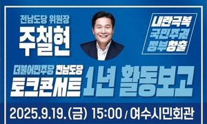 19일 오후 여수시민회관에서 '내란극복 국민주권 정부창출 더불어 민주당 전남도당 1년 활동보고 토크콘서트'가 열렸다. 이날 안진걸 민생경제연구소장 등 지역 국회의원, 여수갑·을 지역위원회 고문단과 읍면동 협의회장 등 당원 1500여명이 참석했다. 주철현 전남도당위원장(전남 여수갑)은 200억대 사기 대출 혐의로 아들이 징역 4년형을 선고받은 것과 관련해 "윤석열 검찰의 정치 탄압"이라고 규정하며 억울함을 토로하며 "이 보증제도를 이용한 의료인들이 더이상 불안에 떠는 일이 없도록 하겠다"라고 관련법 개정을 예고했다. 2시간 이상 진행
