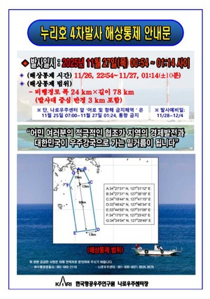 여수해양경찰서는 “한국형 발사체 누리호 4차 발사를 앞두고 나로우주센터 주변 경계 강화와 함께 발사 2시간 전부터 발사 후 10분까지 해상통제구역 내 선박 통항을 전면 차단 한다”고 밝혔다.* 발사예정시간: 27일 00:54~01:14 사이 / ** 통항금지시간 : 26일 22:54~발사 후 10분여수해경에 따르면 27일 오전 01시께 고흥 나로우주센터에서 발사예정인 한국형 발사체 누리호 4차 발사에 앞서 발사대 주변 해상과 발사체 비행 방향 해역 내 선박진입 차단 및 우회조치 등 해상안전통제에 나선다.해상통제구역은 나로우주센터 발