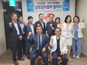 가을비가 촉촉히 내리는 11월 첫날 여수가온병원이 여수농협과 조합원 및 임직원 건강증진을 위한 상호업무협약식을 맺었다.이에 따라 ▲종합건강검진, 일반검진 등 건강검진과 관련하여 임직원 및 가족, 조합원에 대한 건강증진 의료서비스 ▲조합행사 시 의료지원 ▲건강정보 및 기타 필요한 사항 지원 및 할인 적용 서비스를 지원키로 합의했다. 이날 여수농협 박헌영 조합장과 가온병원 이경록 병원장을 비롯 12명이 협약식에 참여했다.가온병원 이경록 병원장은 "오늘 여수농협과 저희 여수가온병원이 건강검진과 진료비 할인에 대한 업무 협약을 맺게 된 것