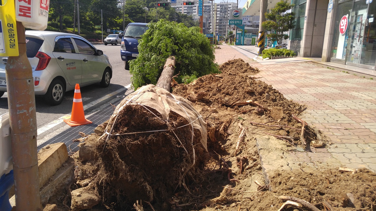 여수시는 지난 5월부터 여수시청 1청사가 위치한 도원사거리와 장성삼거리에 가로수 교체사업을 추진 중이다. 이 과정에서 30년 된 수목들이 싹둑 잘려 나갔다. 또 멀쩡한 인도가 파헤쳐져 도로 정비공사가 한창이다.