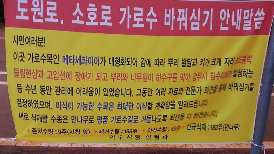 여수시가 추진 중인 '2016년 도원로, 소호로 가로수 바꿔심기사업'은 나무식재 비용으로 2억5600만원(지특 50%, 시비 50%)이 편성됐다. 또 이로 인한 도로정비 공사비용으로 5억 원이 투입된다. 사업량은 시청부터 도원로까지 2.5km에 이르는 거리다. 여수시는 30년 된 메타세콰이아를 잘라내고 5년도 안된 작은 수종의 먼나무를 심었다. 188그루가 교체된다.
