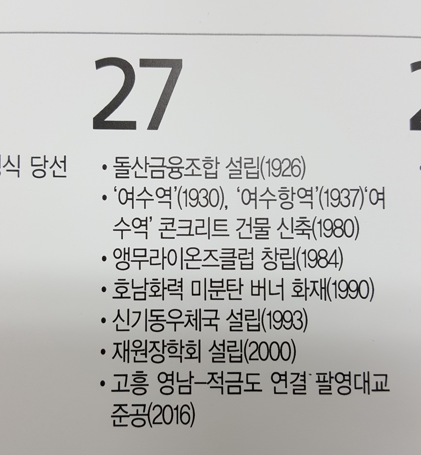 “출판 기념회라고 해야 하나? ‘여수역사달력’ 발행을 기념하는 이벤트를 준비하고 있다. 27일(수) 오후 6시 예울마루 7층 전시장에서 갖는다. 이번 달력은 100부만 발간할 예정이다. 저는 재능기부를 하고 발간기념식에 오신 100분에게 나눠 드릴거다. 달력을 받으신 분들이 저마다 십시일반 달력 값을 성의껏 내면 이 기금을 마중물로 인문학 관련 전공자들의 청년 일자리 제공에 사용할 예정이다. 여수는 이공계 대학 취업기회는 어느 정도 주어지지만, 인문학 계열 출신자들의 일자리는 막연하다. 그래서 인문학도 청년 일자리 마중물로 쓸 계획이다.