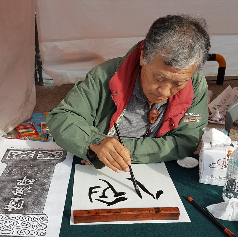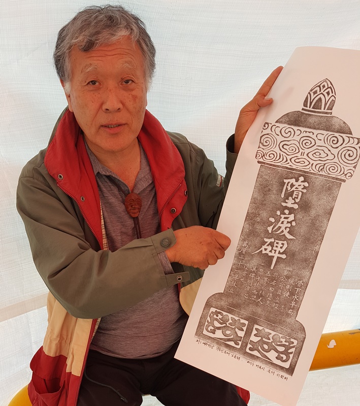 “매년 여수 서예인들이 거북선축제에 참가해 재능기부로 가훈도 써주고 이순신 장군의 시 문구를 써주는 활동을 해오고 있다. 올해는 뭔가 색다른 준비를 하자는 50명의 회원들 뜻이 모아져 타루비 탁본을 준비했다. 먹이 잘 안 번지도록 하는 데는 산벗나무가 최고다. 여기저기 수소문해 마침 구례의 작은 제재소에서 구했다. 타루비 모형 서각을 이용해 탁본을 떴다”
