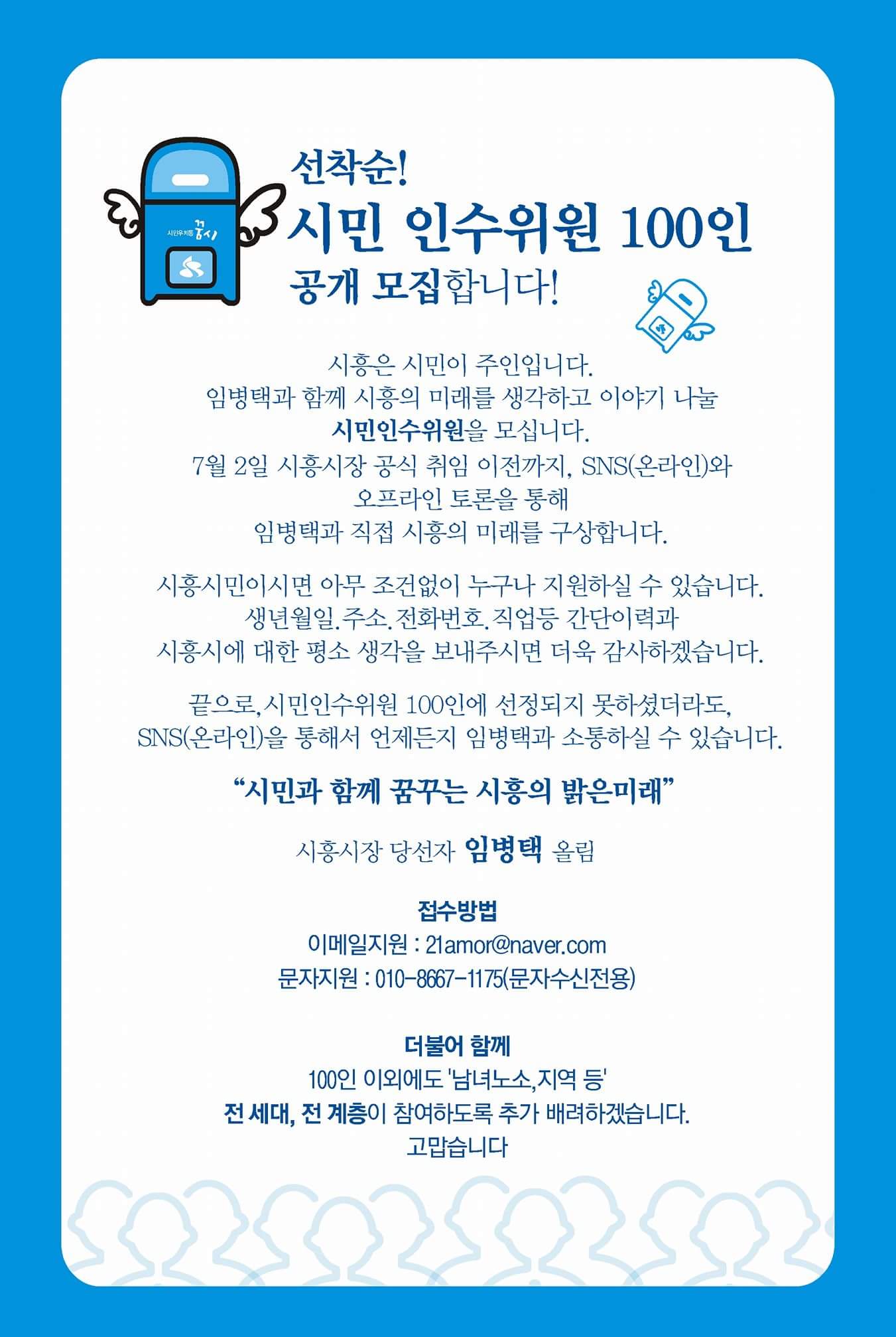 최연소 시장답게 임 당선자는 SNS를 통해서 선착순으로 ‘시민인수위원회’ 100인을 모집하고 있다. 7월 2일 취임식 이전에 온라인과 오프라인에서 이들과 함께 새로운 시흥의 미래를 함께 꾸려갈 생각이라며 이는 ‘시민주권’의 실현이라고 주장했다.