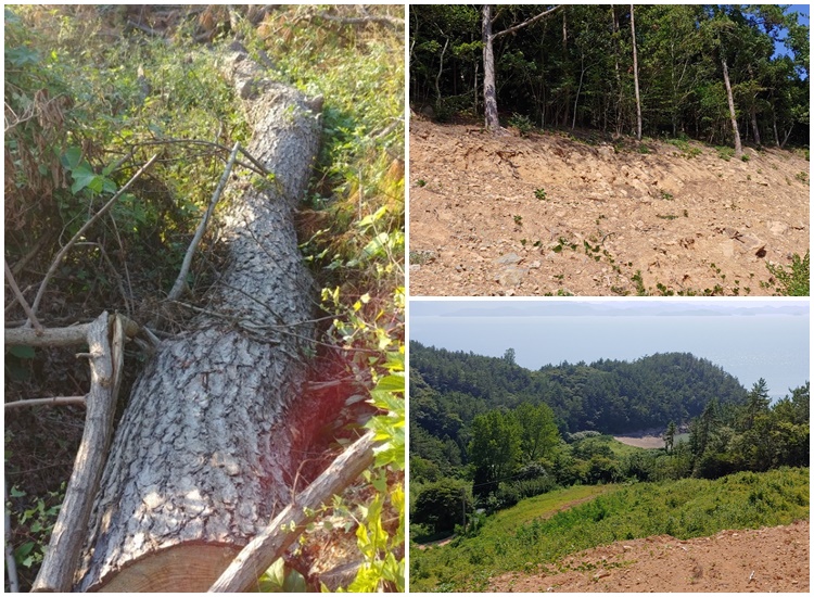 허가가 나자 이 업체는 공사에 착수했다. 업체 측은 불도우저식으로 부지확보를 위한 벌목작업과 입목폐기물 처리를 완료하고 80~90%의 토공작업도 진행했다. 이 과정에서 허가지역이 아닌 마을주민 땅에 수십 년간 자란 나무를 무단으로 벌목해 고발 조치됐다. 이후 원상복귀 명령을 내렸지만 현재 새로 심은 나무는 다 말라죽은 상태다. 지난달 29일 여수시 산림과는 기자에게 원상복귀 명령을 다시 내리겠다고 약속했다.