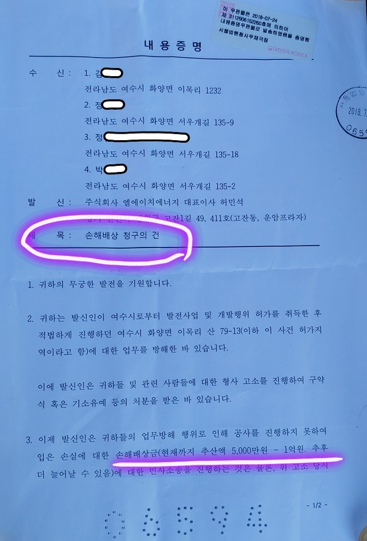 마을주민 박아무개(70대)씨는 “태양광 업체가 마을 주민 4명에게 5천만 원에서 1억원의 손해배상을 청구했다“면서 ”여수시가 법과 동네반대를 무시하고 무리하게 밀어붙여 업자만 배불리는 허가에 동네 노인들이 이 고생을 하고 있고, 수십년을 자란 나무들이 다 벌목되었다“라며 울분을 토했다.
