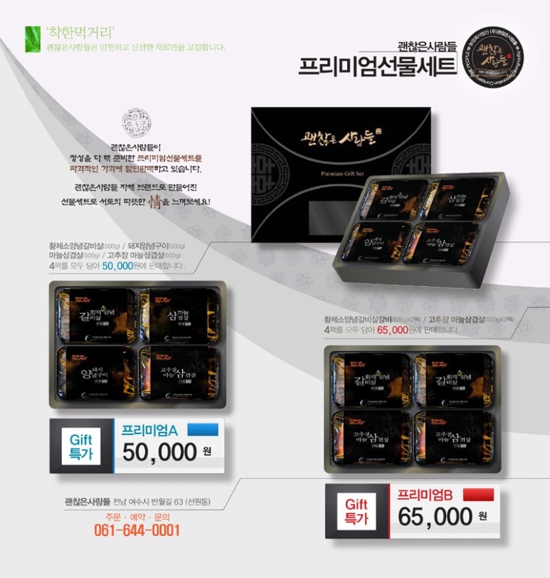 한편 괜찮은 사람들은 추석을 앞둔 요즘 추석명절을 맞아 착한 먹거리를 시판중이다. 십만 원인 프리미엄 등급의 4팩을 5만원에 판매중이다. 황제소양념 갈비살, 마늘 삼겹살, 돼지양념구이, 고추장 마늘 삼겹살로 구성되었는데 간편하게 구워먹으면 된다. 또 십이만 원인 황제소양념갈비살 2팩 과 고추장 마늘살겹살 2팩을 육만 오천 원에 판매중이다.
