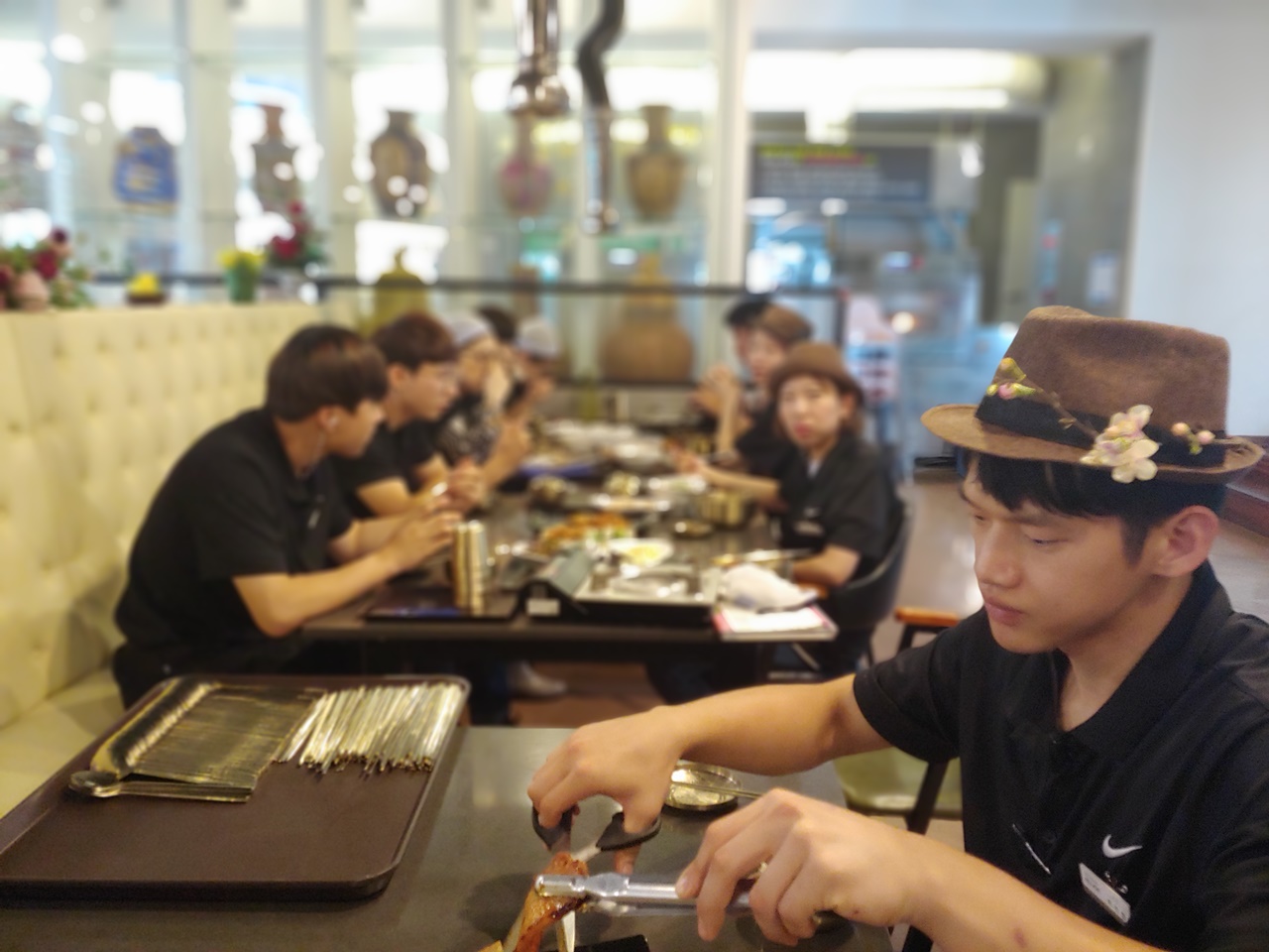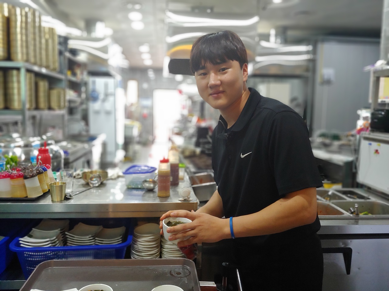 또 홀에서 서빙업을 담당하는 정여호수아(18세) 군은 이곳에서 일하게 된 동기는 처음 알바문을 보고 연락을 했는데 엄마의 지인이라는 사실을 알게 되어 일하게 되었다. 고등학교 1학년 때 검정고시를 패스해 농업대학을 가고 싶다는 정군은 ”처음부터 손님이 많은 것은 알았지만 일하다 보니 힘든 일보다 즐거운 일이 많다“면서 ”자주 300여명이 꽉 찰 정로 정신이 없지만 잘 배워서 이 사업을 꼭 해보고 싶다“라는 포부를 밝혔다.