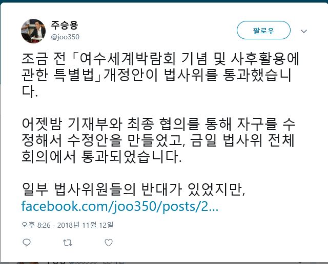 국회 주승용 부의장은 13일 오후 1시 30분경 여수세계박람회법 개정안이 국회 법사위를 통과했다고 트윗과 페이스북을 통해서 밝혔다.