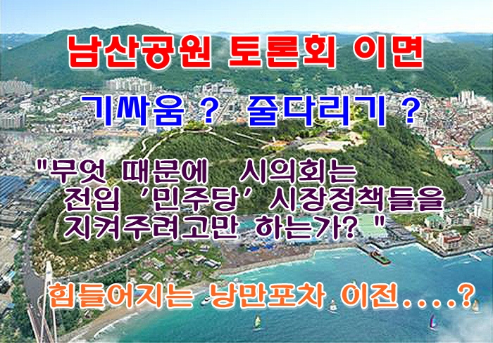 토론 결과, 이걸 어떻게 받아들이고, 어떻게 해석하면서 현 여수시장이 남산개발을 어떤 방식으로 추진해 나갈것인가는 기싸움의 향방과 갈등을 풀어나가는 정치력 발휘에 대해 관심이 크다.