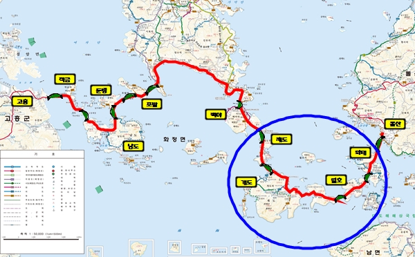 현재 11개 연륙·연도교 3개(돌산~화태, 백야~화양, 적금~고흥)는 공용 중이며 4개 섬을 연결할 연륙·연도교(화양~조발~둔병~낭도~적금)은 금년 12월 중에 개통 예정이다.