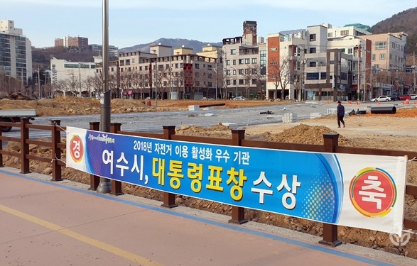 미평 공원 관통도로 공사 중지된 바로 그 자리 데크에 현수막이 하나 걸려있다. 대통령 표창 현수막. 여수시는 그 곳 자전거 길 잘 된 것을 포함해서 '자전거타기 좋은 활성화된 도시' 로 대통령상를 받았다. (관련기사 : 여수시, ‘자전거 이용 활성화’ 대통령표창 )