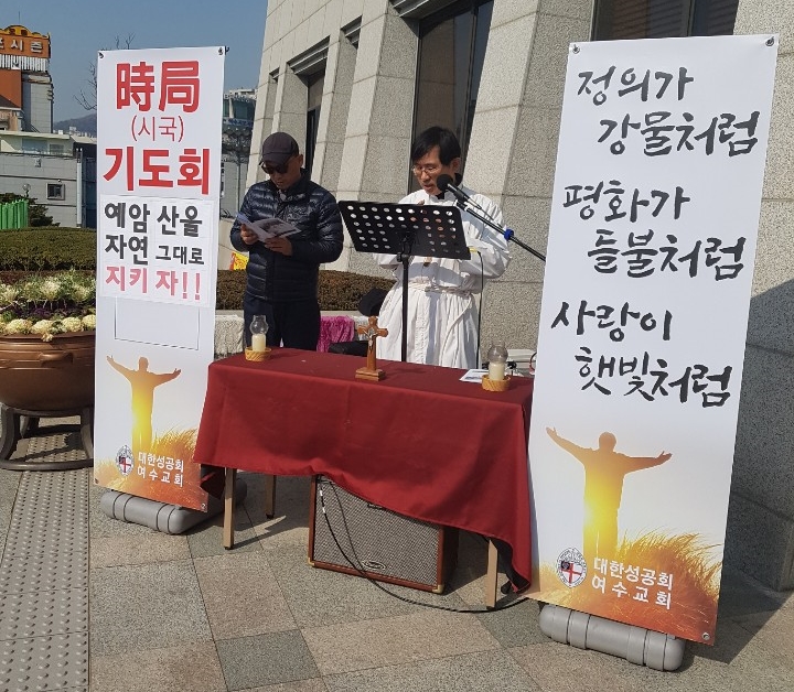 대한성공회 여수교회는 지난 13일 여수시의회 현관 앞에서 예암산 자연 보존과 시민공원 유지를 위한 기도회를 열면서 남산공원을 자연친화공원으로 지정할 것을 시의원들에게 촉구하고 나섰다.