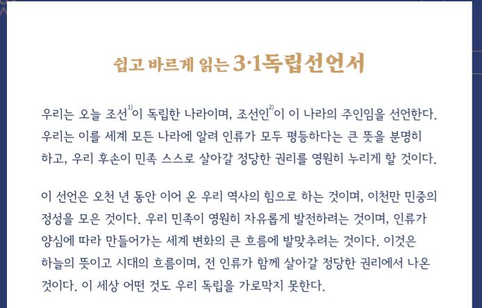 이제 다시는 외세에 의해 나라가 침탈당하는 일이 있어서는 안 된다. 100년 전 1919년 식민지 조선의 민중들은 전국 방방곡곡에서 대한독립 만세를 외쳤고, 이 운동은 비폭력과 평화의 정신으로 전개됐다. 100년 전 우리 선조들이 벌였던 '촛불혁명'이었다.