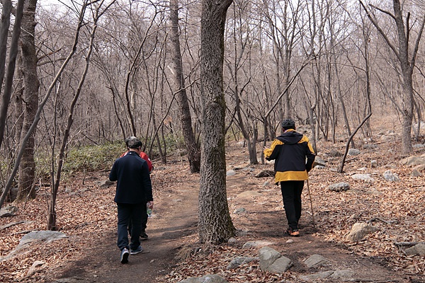 '굴목재몬당'까지 가는 등산로 주변에는 수많은 그루의 참나무들이 자라고 있었다. 등산로 주변에 허옇게 뿌리를 드러낸 채 죽어가는 나무뿌리를 보던 김배선씨가 안타까운 마음을 토로했다.