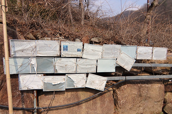 김배선 씨는 사비를 들여 조계산 요소요소에 100여 개의 이정표를 만들어 세웠다. 원조 보리밥집 옹벽 옆에는 그동안 김배선씨가 조계산 곳곳에 만들어 붙인 전설과 이야기를 전하는 내용이 붙어있었다. 등산을 마치고 집으로 돌아가는 길에는 매화꽃이 피어나고 있었다.