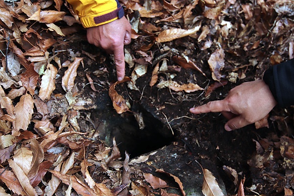 "이곳 아지트를 맴산골아지트라고 부릅니다. 개천가 바위 사이에 굴을 파서 만든 20여 명이 은신할 수 있는 인공아지트입니다. 발각되지 않기 위해 팔 때 나온 흙은 물에 흘려보냈고 흙탕물이 아랫마을까지 흘러가지 않도록 자정 무렵에 마쳤다고 합니다."