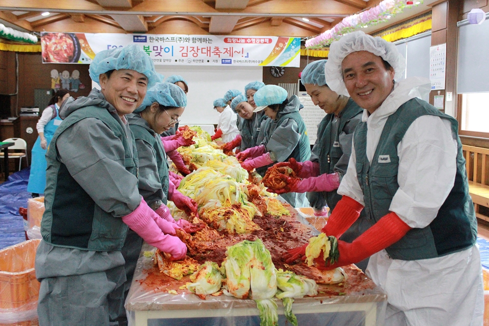 이운신 한국스프(주)여수공장장 이하 20명의 임직원들은 길러온 횟집바닷물과 천일염으로 해남배추와 돌산갓김치를 손수 절여 어머니 손맛이 가득 담긴 김장김치를 버무렸다.
