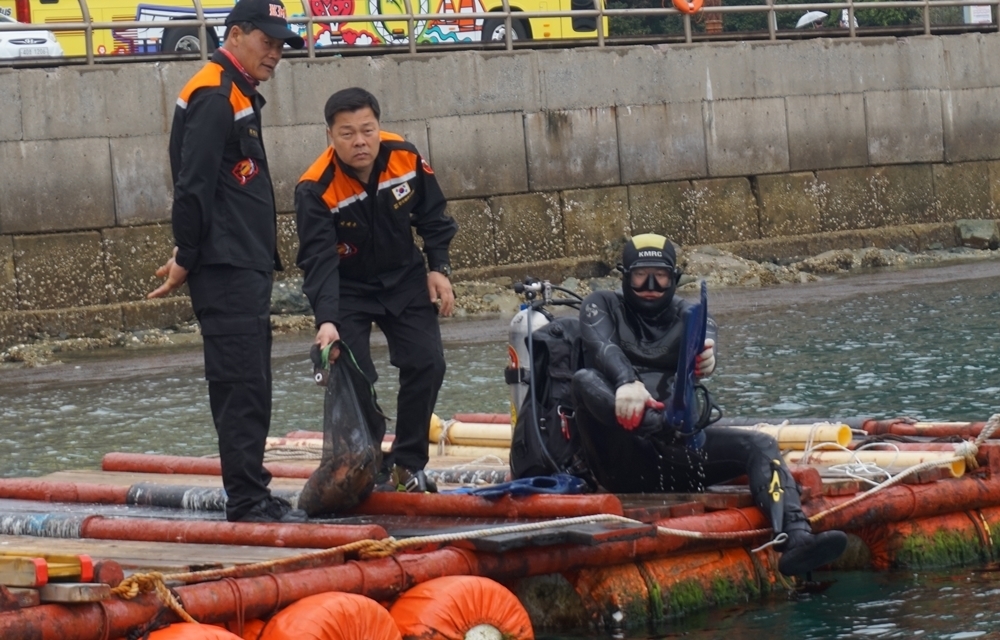 비가 왔지만 15명의 잠수부들은 청소를 마치고 올라오면서 한목소리로 “오늘은 시야가 넓어 다행”이라고 말했다. 물때가 좋기 때문에 잠수하기에 최적의 조건이라는 것이다. 박 대장 역시 비가 자주 오는 시기인만큼 이를 감안하고 작업에 들어갔다.
