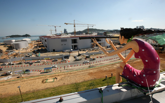2012여수세계박람회 조직위원회(위원장 강동석 이하 조직위)는 김경민 작가의 작품 ‘꿈꾸는 세상’을 무상 임대해 조직위 사무국 옥상에 설치했다고 4일(화) 밝혔다. 발랄한 핑크색 원피스를 입고 망원경을 통해 박람회장을 바라보는 롱다리 여자의 모습이다.