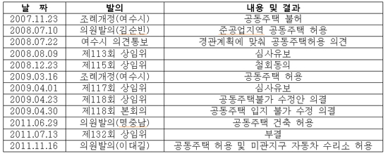 당시 여수시도 경관계획에 맞도록 이라는 단서조항을 달았지만 공동주택을 허용하도록 하는 의견을 의회에 제출했다. 1년 만에 여수시의 입장이 정반대로 바뀐 것이다. 그러나 이 개정안은 각종 논란 끝에 같은 해 8월 상임위 심사유보, 12월 개정안 철회로 이어지면서 일단락되는 듯 했다.