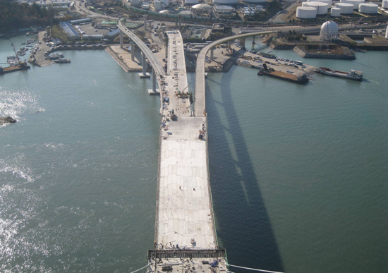또한, 연장 1,411m, 폭원 25.9m의 해상교량으로 연결하고 있으며, 지난 2007년 11월 착공식을 가진 후 주탑 2기(166m와 162m)와 상부 측경간 강교가설, 중앙경간 케이블 및 강교가설, PC판넬 설치 등이 완료됐다.