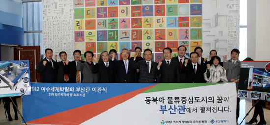 2012여수세계박람회 조직위원회(위원장 강동석, 이하 조직위)는 허남식 시장 등 부산시 관계자 20여 명이 9일 여수세계박람회 조직위원회를 방문, 부산관 전시 내용을 소개하고 입장권 구매, 지정업소 현판 수여식 등 행사를 가졌다.