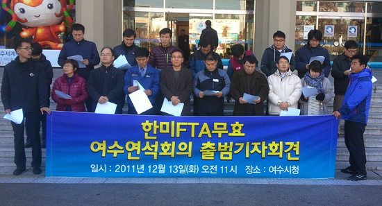 한미FTA무효 여수연석회의(이하 연석회의)는 13일 여수시청 현관계단에서 출범기자회견을 열고 본격적인 한미FTA 비준무효 운동에 돌입했다.