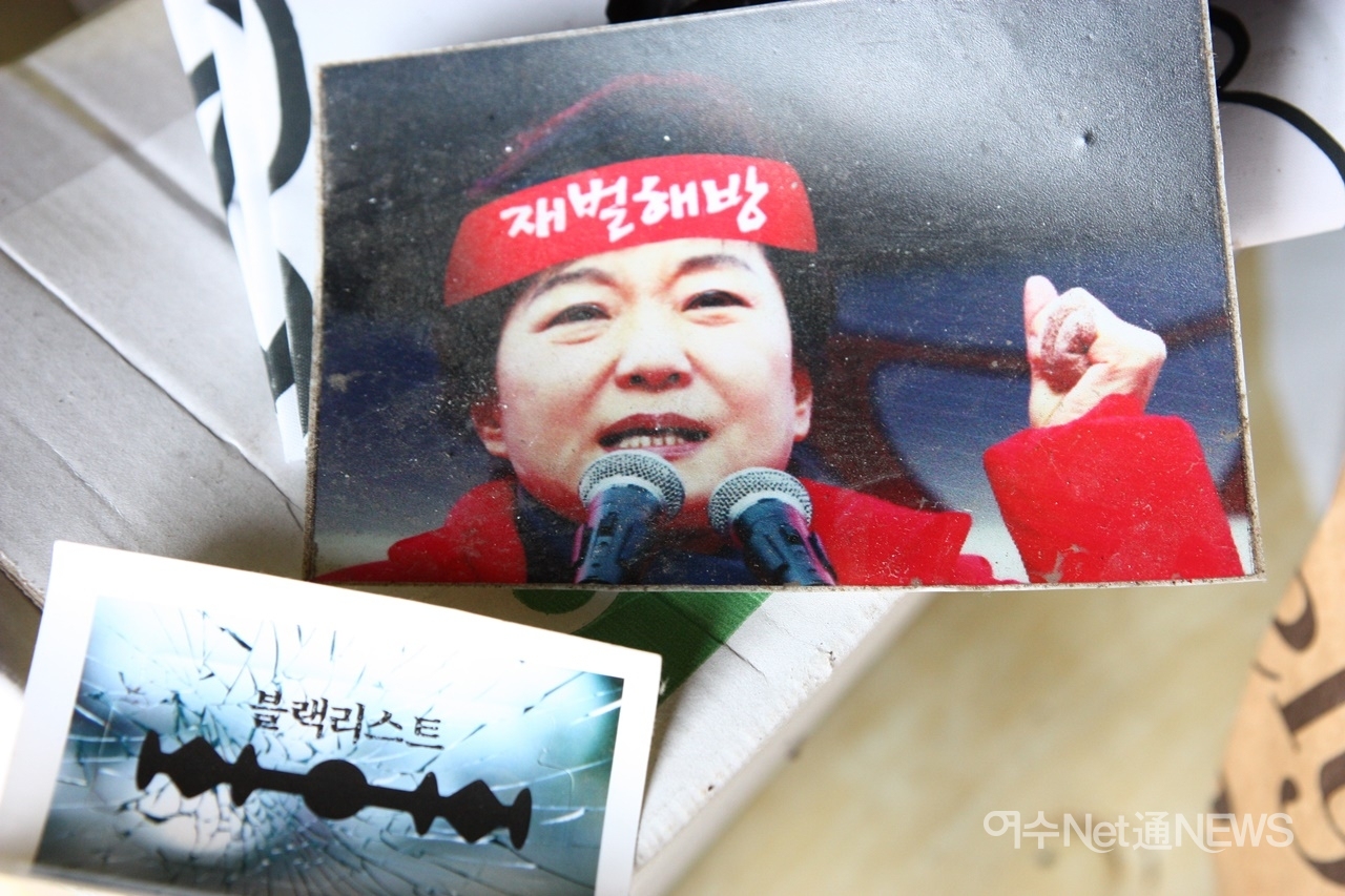 작업실 곳곳에는 독재와 싸운 흔적들이 즐비했다. 박근혜퇴진, 블랙리스트, 환경운동 관련 작품들이 어지럽게 널려 있었다. 큰방에는 칼날 테러를 당한 이한열 열사의 대형 영정사진 등 몇몇 작품들이 방하나를 차지했다. 여기저기 커터칼로 난자된 상흔에 눈살이 찌푸려졌다.