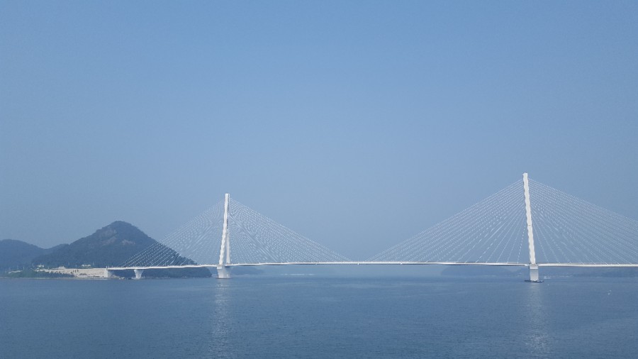 파란 바다 위에 떠있는 수십 개의 섬들과 하얀 현수교 화태대교의 모습이 아름답다.