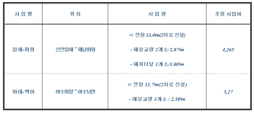 한편 국도 77호선 ‘압해-화원’과 ‘화태-백야’ 사업은 현재 기획재정부의 사업계획 적정성 검토가 진행 중이다. 연내 설계·시공 일괄 입찰(턴키) 방식으로 발주 예정이다.