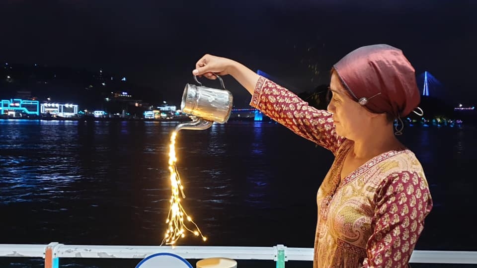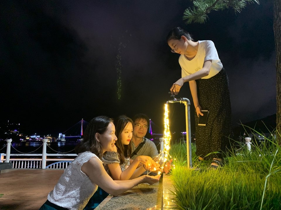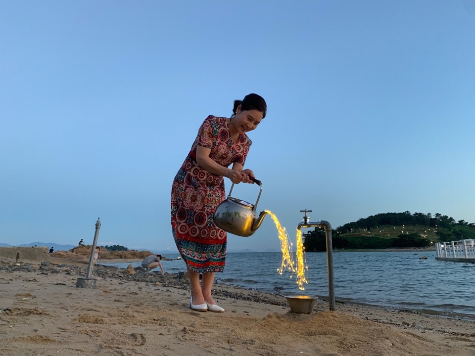 작품 ‘빛물’ 앞에 사람들은 신기한 듯 모여들면서도 선뜻 카메라 앞에 서지 못했다. 그런 그들을 최 작가는 자연스럽게 카메라 앞에 세워 작품을 체험하게 한다. 가히 현장작가답다.