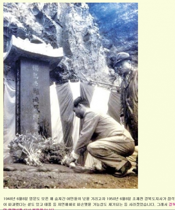그런데 독도폭격 원혼을 달래기 위해서 독도에 세웠던 위령비가 어느 날 감쪽같이 사라졌다. 태풍으로 사라졌는지, 누가 무엇 때문에 없애 버렸는지 알 길 없었다.