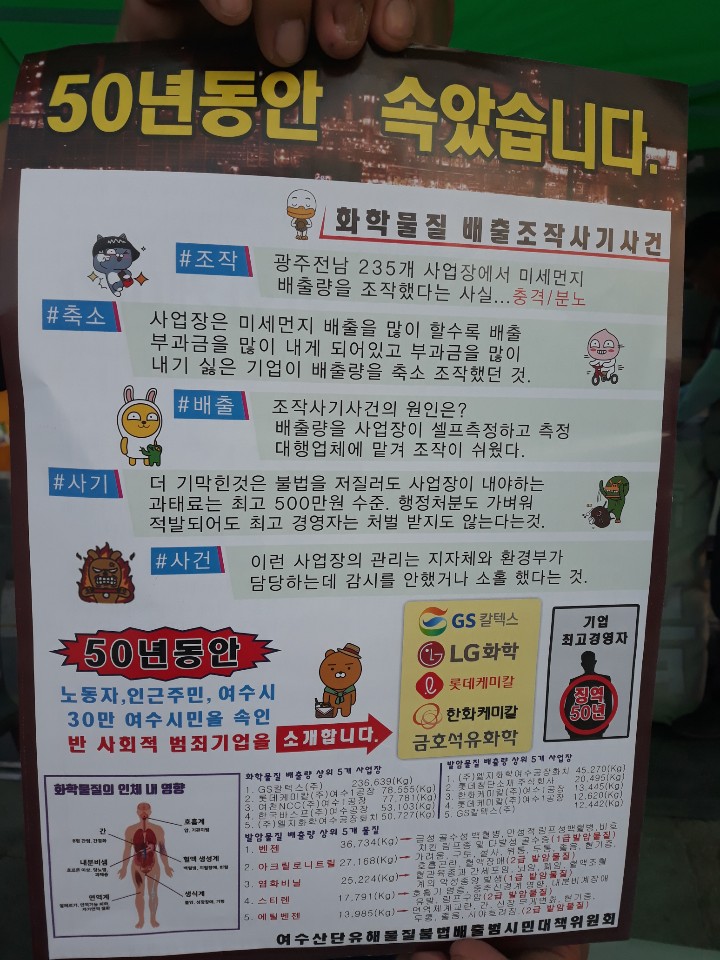 이어 “산단 근무자들은 유해물질로 인해 가족과 친구들이 암에 걸려도 아무렇지 않은 것인지 매우 혼란스럽다”며 “법은 함께 살기 위한 최소한의 규칙이며 공정한 규칙 속에 정정당당히 경쟁하며 발전하는 것이 옳다고 생각한다. 그러나 여수산단의 기업들이 이윤 때문에 모두를 힘들게 하는 모습에 슬픔을 금할 수 없다”고 말했다.
