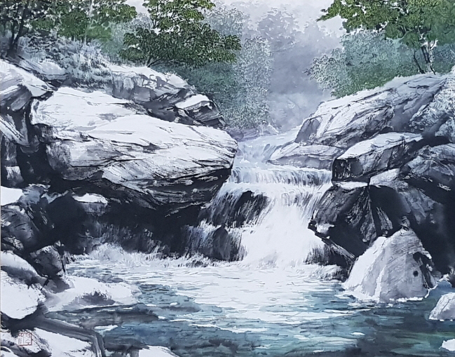 서 팀장은 “오래전 찾은 지리산에서 거침없이 흐르는 계곡과 바위, 나무로부터 영감을 받아 자연의 생동감과 한국화만이 가진 수묵의 진한 채색감을 가감없이 표현내고 싶었다”며 작품제작의 배경을 설명했다.