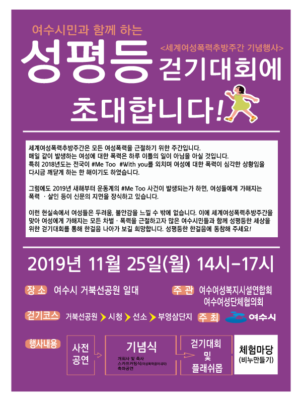 ‘세계여성폭력추방의 날’을 맞아 25일 오후 2시부터 5시까지 거북선공원에서 '성평등 걷기 대회' 기념행사가 열린다.
