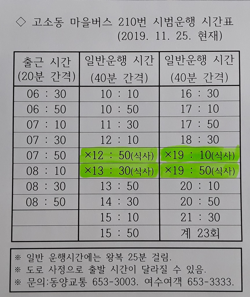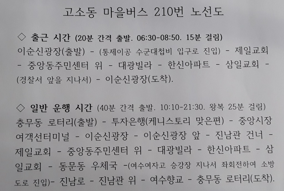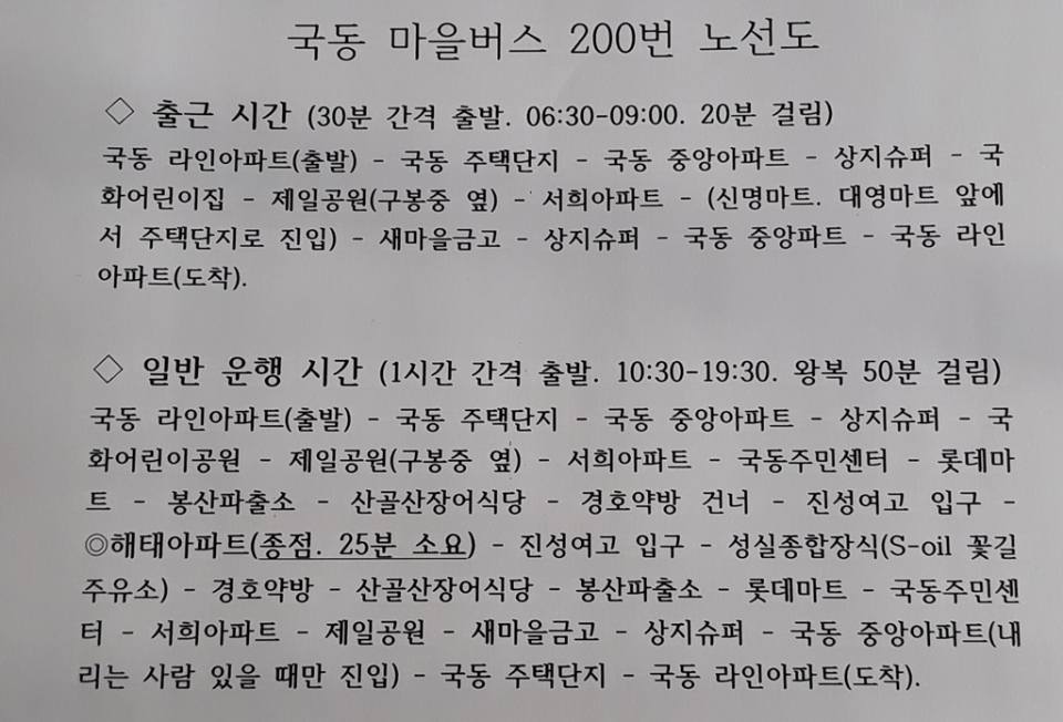 마을버스 이용자의 편의를 위해서 주요 지점에 시간표를 붙여 주고, 아파트 관리사무소나 주민센터에서도 시간표 등을 복사해서 시민들에게 제공해 주면 좋겠다.