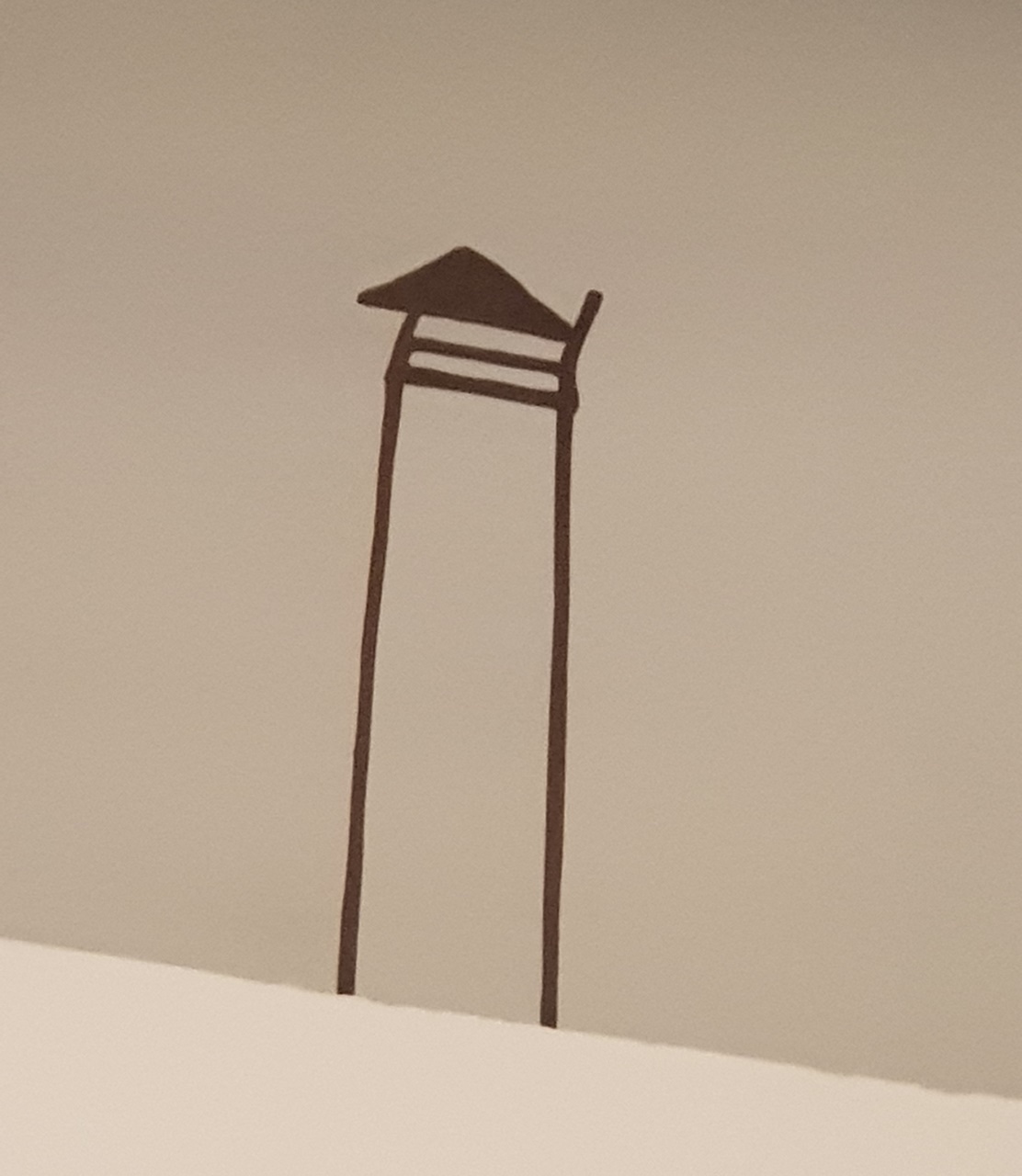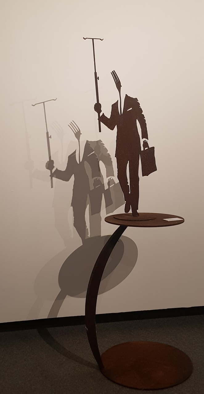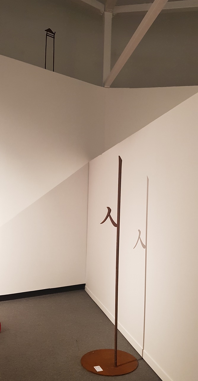 불쑥불쑥 전시장 칸막이 위 공중에 나타나기도 하고, 담장이 걸리는 것 같기도 하고, 바닥에 널부러져 있기도 하고, 그림자를 일부러 비춰주려고 벽 앞에 우두커니 서 있기도 하다. 그야말로 전시장 곳곳이 전시공간이다.