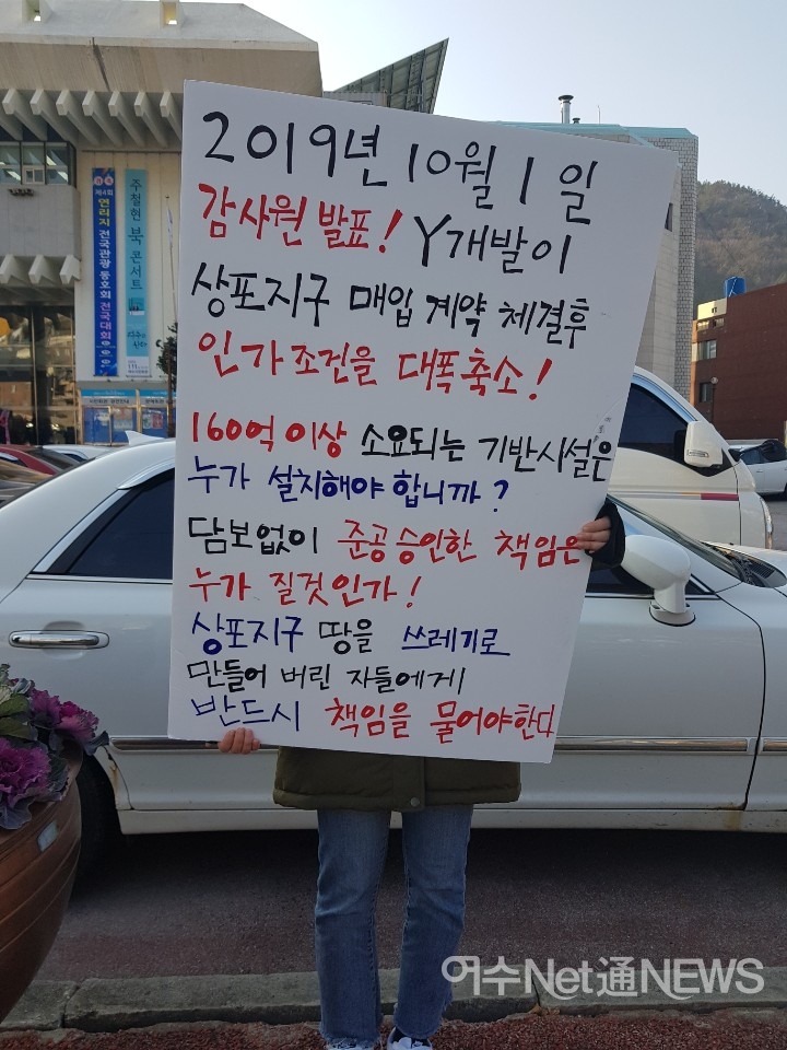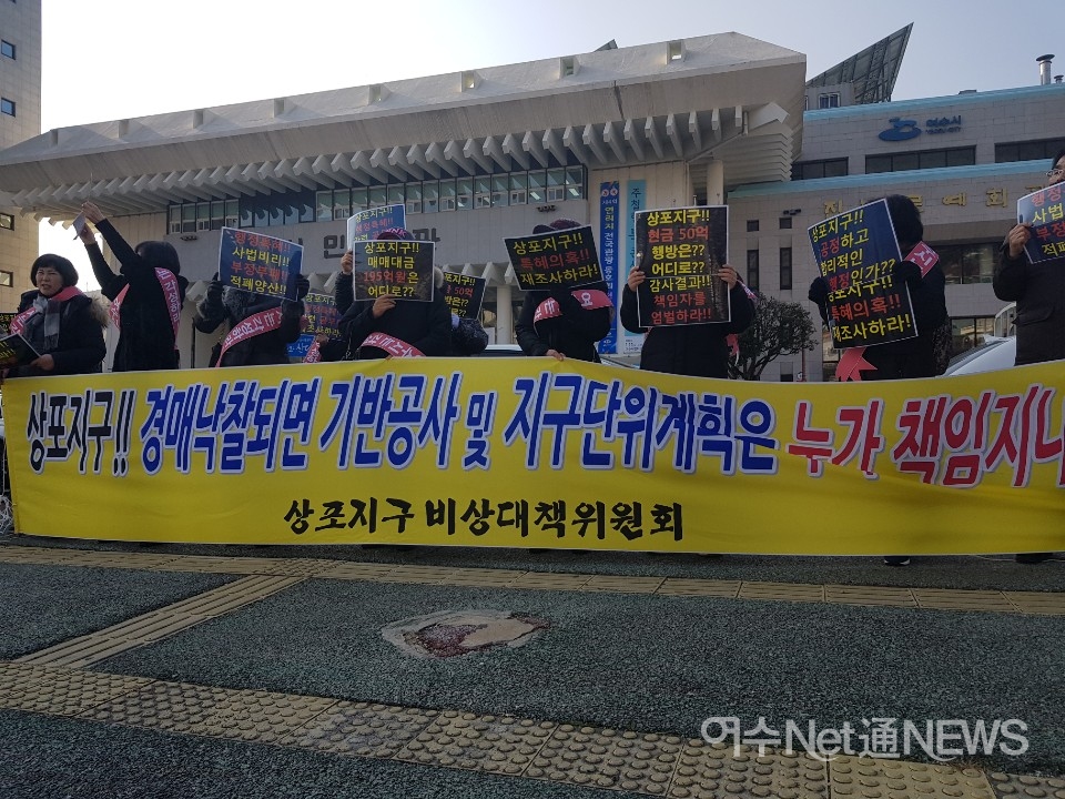 밖에서는 전 여수시장 재직시 논란이 일었던 상포지구 피해자들이라고 밝힌 ‘상포지구 비상대책위원회’가 “상포지구!! 경매낙찰되면 기반시설공사 및 지구단위계획은 누가 책임지나” 대형 형수막을 앞세우고 피켓시위를 벌였다.