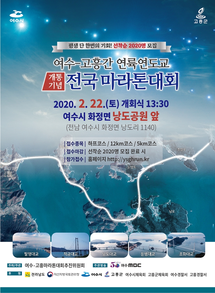 여수와 고흥을 연결하는 5개의 연륙연도교가 완전 개통을 앞두고 있는 가운데, 양 시군이 개통 축하 마라톤대회를 개최키로 하는 등 축하 분위기 조성에 나섰다.