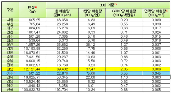 김 국장에 따르면 여수시 1인당 CO2 발생량은 75t으로 가장 많다. 서울(4.83t)에 비해 무려 15.5배나 많이 발생하고 있으며 또 같은 화학도시인 울산의 36.12t 보다 2배 가량 많다. 전국 평균 10.24t 보다도 7배나 많이 CO2를 발생하고 있다.