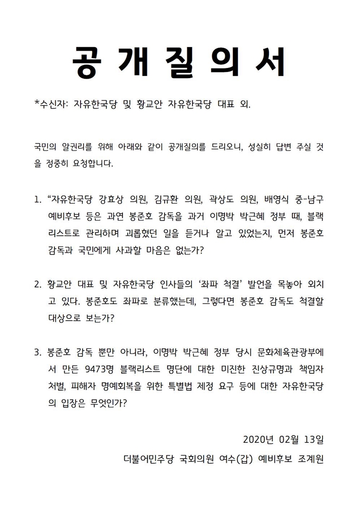 조 예비후보는 13일 자신의 페이스북에도 게재한 '국민을 대신해 자유한국당에 공개 질의합니다'라는 질의서를 공개하며, 최근 봉준호 감독의 ‘기생충’ 아카데미상 4관왕 석권의 역사적 쾌거를 정치적으로 악용해 문제가 되고 있는 자유한국당과 해당 의원들에 대해 공개질의 형식으로 쓴소리를 쏟아냈다.