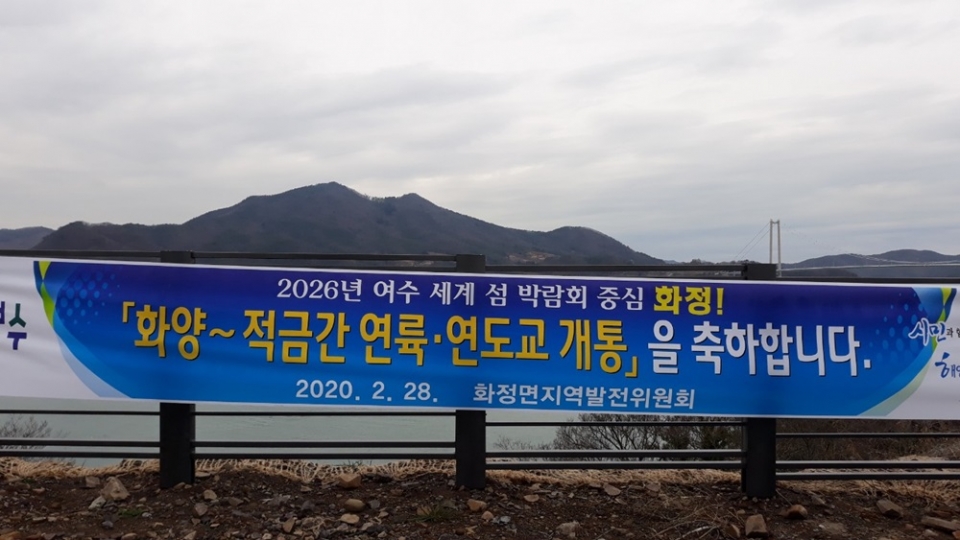 여수시 화양면 장수리∼화정면 적금 간 도로건설공사는 총연장 17km로 여수시 4개 섬(조발도·둔병도·낭도·적금도)을 연결하는 사업으로, 지난달 28일 오후 3시에 개통됐다. 개통식은 오전 10시에 할 계획이었으나, ‘코로나19’ 사태로 취소됐다.