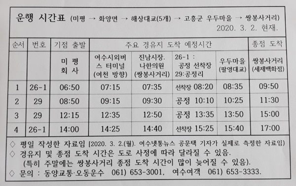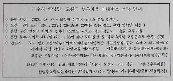♢ 운행 횟수 : 왕복 4회/일 (26-1, 29번 각각 5회 운행 중 각각 2회씩 고흥군으로 연장 운행)