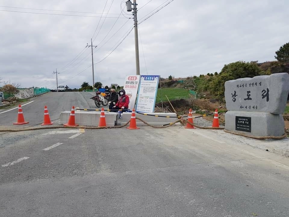 낭도 주민들이 코로나 예방을 위해 마을 입구를 막고 있다