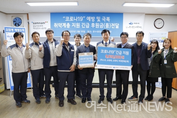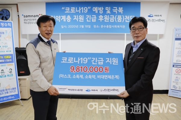 삼남석유화학(주) 여수공장(이오식 공장장)이 코로나19로 인해 어려움을 겪는 취약 계층에게 후원금 981만원을 전달하였다.