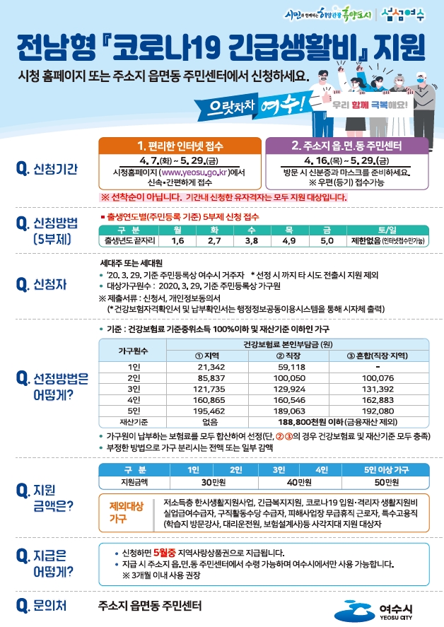 한편 여수시는 정부의 지원기준과 지침이 내려오는 대로 긴급재난지원금 및 여수형 긴급재난지원금을 신속하게 시행할 방침이다.