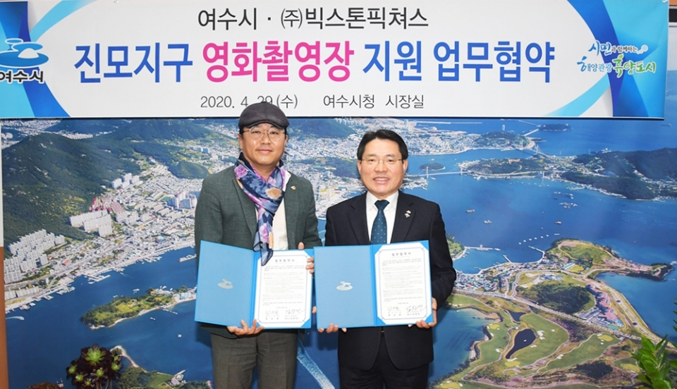 29일 오전 여수시청 시장실에서 권오봉 여수시장과 ㈜빅스톤픽쳐스 김한민 감독이 진모지구 영화 촬영장 조성을 위한 업무 협약서에 서명했다.